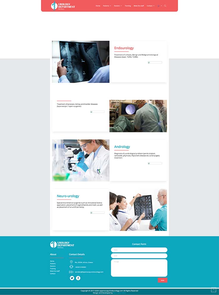 - Σχεδίαση και Ανάπτυξη: Αναπτύξαμε την ιστοσελίδα χρησιμοποιώντας WordPress, με έμφαση στη δημιουργία μιας επαγγελματικής και χρηστικής πλατφόρμας που αντικατοπτρίζει την ποιότητα των ιατρικών υπηρεσιών του Τμήματος Ουρολογίας. Το σχέδιο είναι φιλικό προς τον χρήστη και παρέχει εύκολη πλοήγηση.